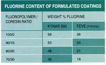 ![]() In typical formulations [see shaded areas]. Kynar 500 resin-based coatings contain higher fluorine levels than FEVE-based coatings, resulting in greater resiliency, color and gloss retention. |
