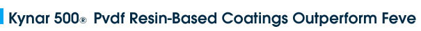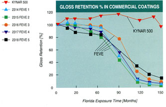![]() In typical formulations [see shaded areas]. Kynar 500 resin-based coatings contain higher fluorine levels than FEVE-based coatings, resulting in greater resiliency, color and gloss retention. |