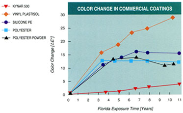 In applications worldwide, Kynar 500® PVDF resin-based metal coatings have demonstrated superior performance and outstanding resistance to film degradation. These coatings will withstand extended exterior exposure to water, humidity, temperature, ultraviolet rays, oxygen and atmospheric pollutants.![]() |